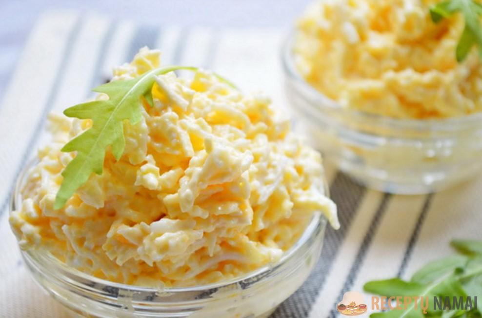 Kiaušiniai ir sūriai sutarkuojami vidutine tarka ir sumaišomi su suminkštintu sviestu, majonezu ir česnaku.
